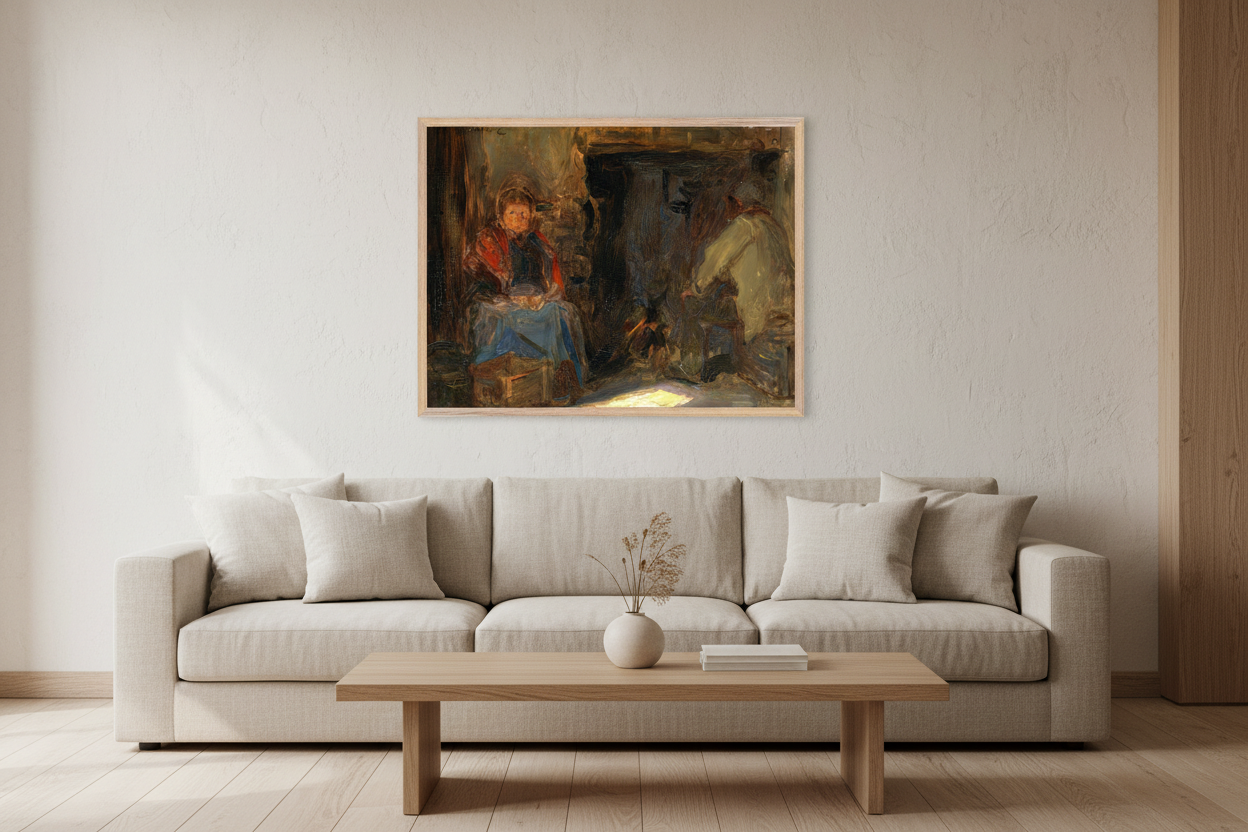 A Galway Cottage is one of Walter Frederick Osborne’s most intimate depictions of Irish rural life. Set within the dim warmth of a traditional cottage interior, the composition captures a moment of quiet domestic stillness shaped by light, labour, and everyday ritual.