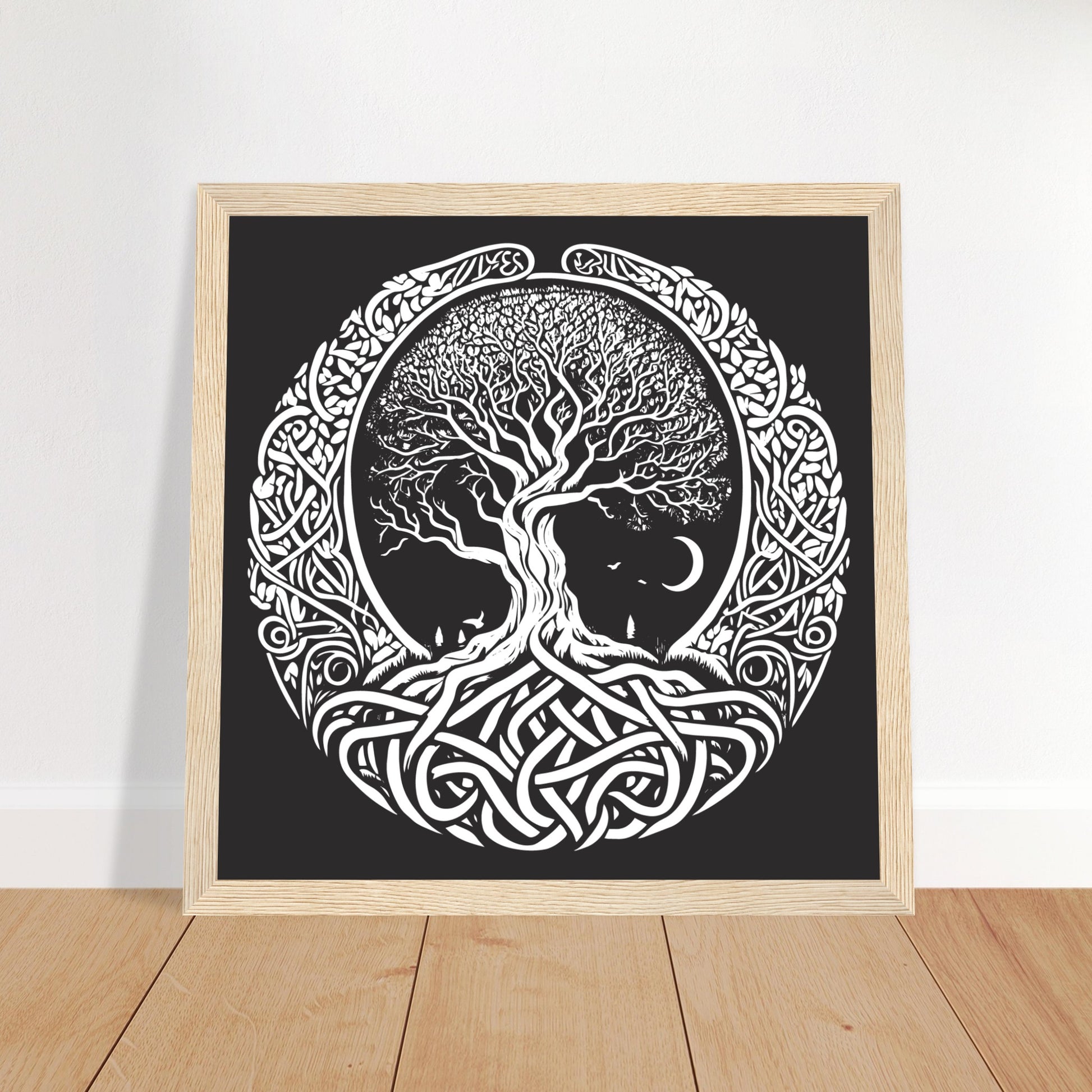 Adorned with floral and leafy motifs in striking black and white tones, this graphic marvel captures the essence of nature, embodying Celtic and Norse symbolism. Its captivating silhouette and ornamentation make it a versatile piece, ideal as a standalone print or as part of your decorative ensemble.